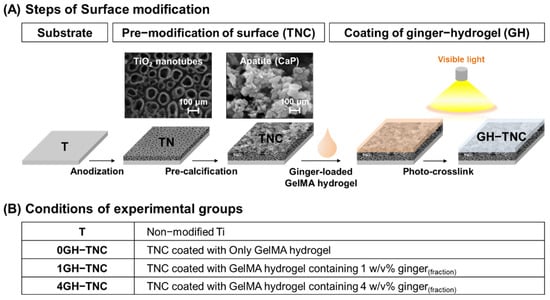 The ginger(fraction)-loaded GelMA(sol) was fabricated using freeze-dried GelMA, triethanolamine (TEA; Sigma-Aldrich, St. Louis, MO, USA), N-vinylcaprolactam (VC; Sigma-Aldrich, St. Louis, MO, USA), eosin Y disodium salt (Sigma-Aldrich, St. Louis, MO, USA), and the ginger(fraction). It finally comprised 5 w/v% GelMA, 1.5 w/v% TEA, 1 w/v% VC, 0.5 mM eosin Y disodium salt, and different concentrations (0, 1, and 4 w/v%) of ginger(fraction). Next, 25 µL of the ginger(fraction)-loaded GelMA mixture was coated on a 1 cm2 area of the TNC-modified surface. It was then photo-crosslinked by curing for 100 s using an LED light-curing unit (C02, Premium Plus, Bournemouth, UK) for polymerization into the hydrogel. The ginger(fraction)-loaded GelMA hydrogel (GH) on the TNC surface was freeze-dried at −80 °C for 3 days using a lyophilizer. The properties of GH−TNC surfaces were compared with that of the non-modified Ti surface. The groups were named according to the concentration (w/v%) of ginger(fraction) in the hydrogel, as shown in Figure 1.