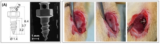 This study was conducted in compliance with the Declaration of Helsinki and was approved by the Institutional Animal Care and Use Committee of the Jeonbuk National University Laboratory Animal Center (JBNU 2022-080). The screw for the in vivo test was designed, as shown in Figure 2A. Screws were implanted on both sides of the tibia of the rats. Next, 24 male Sprague Dawley rats (8 weeks old, 270–280 g weight) were used for implantation in the GH−TNC groups (n = 6). Rats were anesthetized by intraperitoneal injection of 0.6 mL/kg of tiletamine plus zolazepam (Zoletil 50, Virbac Laboratories, Carros, France) and 0.4 mL/kg of xylazine hydrochloride (Rompun, Bayer Korea, Seoul, Republic of Korea). After making a 1 cm incision over the tibia, a hole was drilled in the cortical bone using a contra-angle hand-piece (X-smart Endodontic Motor, Dentsply Maillefer, Switzerland) equipped with a 1.0-mm pilot round-headed burr (H1.316-018, Komet, Germany). The screw was then tightened using a self-tapping process (Figure 2B). Antibiotics (0.6 mL/kg) were administered subcutaneously (Amikacin, Samu Media Co., Ltd., Yesan-Gun, Republic of Korea) after surgery. Twelve rats were euthanized at each time point (2 and 6 weeks) and their tibial blocks were harvested.