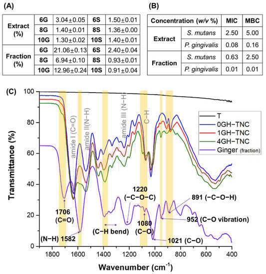 Characterization of ginger(sol) [extract vs fraction]; (A) content of main compounds (%), (B) MIC and MBC against Streptococcus mutans and Porphyromonas gingivalis], and (C) chemical structure with the concentration of ginger(fraction) in the GelMA hydrogel coating on the TNC surface.