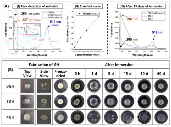 (A) Analysis of the ginger(fraction)-loaded hydrogel by UV−vis [(I) peak-detection of materials, (II) standard curve of absorbance with the concentration of ginger at 287 nm, (III) release of ginger from the hydrogel at 15 days of immersion in DW], and (B) degradation of ginger(fraction)-loaded hydrogels depending on time.