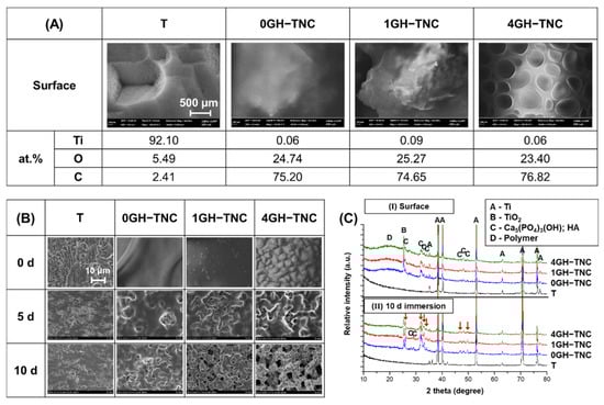 Upon immersion of the GH−TNC surfaces in SBF, the GH layer slowly degraded as the immersion period progressed (Figure 5B). As the coating layer became thinner, the morphology of the pre-modified TNC surface was revealed. The degradation rate of the hydrogel rapidly increased depending on the concentration of the ginger(fraction). Although the T group did not show crystallization of HA after 10 days of immersion in SBF, an increase in precipitation for the HA phase was observed on the surface in all GH−TNC groups, regardless of ginger(fraction) addition (indicated by the red arrows in Figure 5C-II). After GH−TNC coating, the final surface only showed an increase in the concentration of C and O ions owing to the thick polymer layer. However, the XRD results in Figure 5C-I confirm that crystalized TiO2 (anatase) and Ca5(PO4)3(OH) (hydroxyapatite; HA) were present on the surface after pre-modification. There was no phase transformation of the crystal structures in any of the GH−TNC groups. Although coverage of the TNC surface by the hydrogel was observed in all groups, the morphology of the surface mainly depended on the characteristics of the ginger hydrogel (Figure 5A). In the 0GH−TNC group, the top layer was coated with a dense polymer without any pores. However, as the concentration of ginger(fraction) increased, a uniform and porous coating layer was observed.