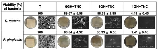 Bacterial viability (%) and morphology on the GH−TNC surfaces for Streptococcus mutans and Porphyromonas gingivalis.