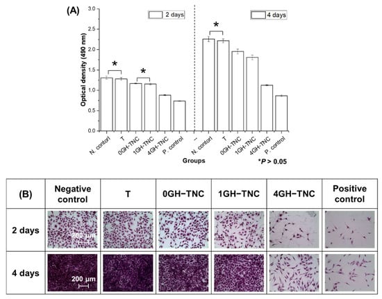 After 2 and 4 days of osteoblast culture, only the non-coated group showed no significant difference from the negative control (p > 0.05) (Figure 7). Higher concentrations of ginger(fraction) in the GH−TNC groups significantly decreased cell proliferation. On the fourth day of culture, the 4GH−TNC group showed a low cell viability of approximately 50% compared with that of the negative control for all cells, and the possibility of cytotoxicity was confirmed. However, except for the 4GH−TNC group, all GH−TNC groups were compatible with osteoblasts as they showed more than 70% cell viability.