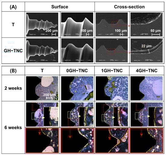(A) SEM images on the surface and cross-section after GH−TNC coating on the Ti screw; (B) histological images after implantation of the surface-modified screw on the tibial defect of a rat for 2 and 6 weeks.