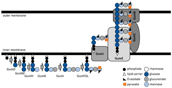 The precursor biosynthesis is followed by the processes of building and decoration of pentasaccharide subunits at the cell envelope. Among others, the process is initiated by the GumD and GumM glycosyltransferases. While the former transfers glucose-phosphate residue from UDP-glucose to an undecaprenyl-phosphate C-55 lipid carrier molecule located at the cytoplasmic face of the membrane [30], the latter adds the second glucose residue to the molecule [31]. Mannose is then transferred to the assembling site by GumH (α-1,3-mannosyltransferase) from GDP-mannose [32], followed by a glucuronic acid residue addition by GumK (beta-1,2-glucuronosyltransferase) from UDP-glucuronic acid [33]. The pentasaccharide subunit is finalized by GumI (beta-mannosyltransferase) activity [34]. The outer, last-added mannose can be pyruvylated by GumL, and the GumG and GumF O-acetyltransferases allow the acetyling of both terminal and inner mannose residues of the repeating unit, respectively [26].