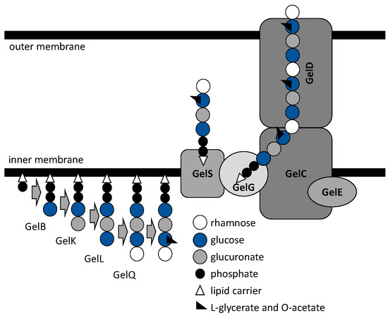 The genes gelS and gelG (homologues to Wzx and Wzy) located in the gel cluster region IV are likely involved in the repeating unit translocation across the inner membrane and polymerization of gellan, respectively. Its chain-length-regulating protein, a polysaccharide co-polymerase, is encoded by the genes gelC and gelE, with the latter reportedly having an ATP-binding activity in vitro [44]. Finally, the gellan chains’ secretion process is regulated by the integral outer membrane auxiliary homologue protein encoded by the gene gelD [45].
