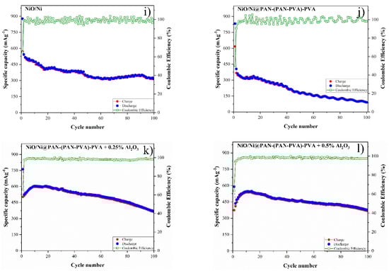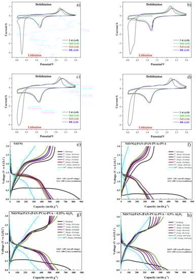 - Spinner, N.S.; Palmieri, A.; Beauregard, N.; Zhang, L.C.; Campanella, J.; Mustain, W.E. Influence of conductivity on the capacity retention of NiO anodes in Li-ion batteries. J. Power Sources 2015, 276, 46–53. [Google Scholar] [CrossRef]