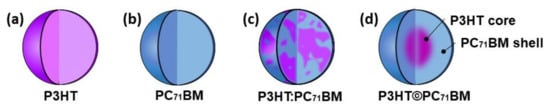 Schematic representation of: (a) P3HT, (b) PC71BM, (c) P3HT:PC71BM blend and (d) P3HT© PC71BM core-shell NPs.