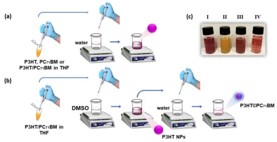 Schematic diagram of the steps involved in the nanoprecipitation method for the formation of (a) P3HT, PC71BM and P3HT:PC71BM blend NPs; and (b) P3HT©PC71BM core-shell NPs. (c) Pictures of (I) P3HT, (II) PC71BM, (III) P3HT:PC71BM blend and (IV) P3HT©PC71BM core-shell colloidal suspensions.