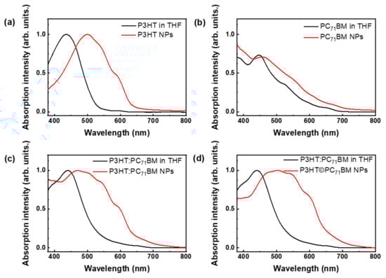Absorption spectra of colloidal suspensions in water of (a) P3HT, (b) PC71BM, (c) P3HT:PC71BM blend and (d) P3HT©PC71BM core-shell NPs in red and a comparison to their stock solutions in THF in black.