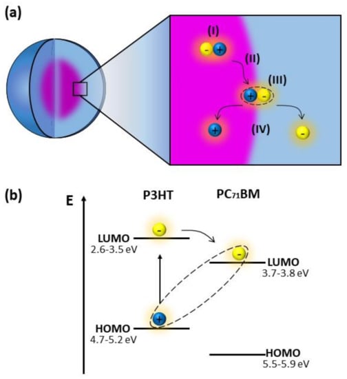 (a) Schematic representation of the processes of generation (I), diffusion (II), dissociation of exciton at the donor/acceptor interface (III) and charge separation (IV)—which occurs when an electric field is applied []. (b) Energy levels (HOMO and LUMO) showing the exciton dissociation at the P3HT/PC71BM interface.