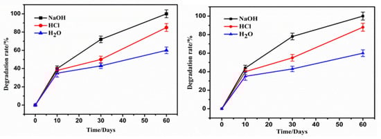 Figure 2 are the time-dependent film mass loss rate for np-PCL films in three different pH solutions: NaOH, HCl, and deionized water. Figure 2 (left) and Figure 2 (right) show the results in two different concentrations of 0.1 and 0.5 mol/L, respectively. As is shown, with the increase in degradation time, the mass loss rate of the np-PCL film gradually increases, regardless of the kinds of solutions used. At the early stage (less than 10 days), the degradation rate of the np-PCL film is large, almost achieving a value of 40%. After that, the mass loss rate is relatively slow but still increases over time. This indicates that the initial stage of degradation is a process of hydrolysis which was caused by the penetrated solutions. In the later stage, the degradation originates from the degradation of polymer molecular chains which takes a long time. In comparison with the concentration of 0.1 mol/L solutions, the degree of degradation in a solution with a concentration of 0.5 mol/L is significantly slow. Under alkaline conditions, it can be found that the mass loss rate of np-PCL film is the largest, followed by HCl and H2O. The mass loss rate of the np-PCL film reached 100% after degradation of 60 d. Through experiments, it was found that the high or low pH environment will accelerate the degradation of np-PCL.