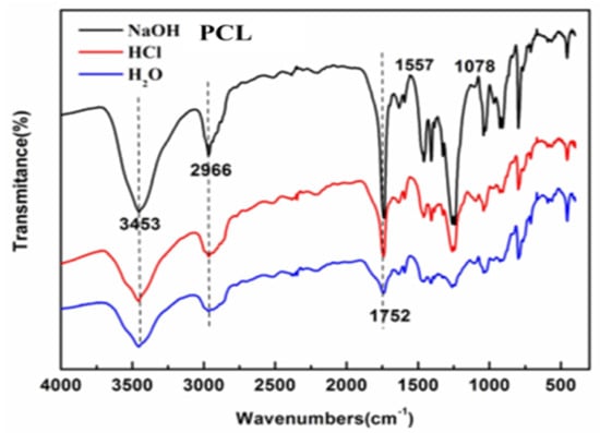 The pH has an important influence on the stability of polyester materials. By immersing the prepared films in aqueous solutions of acid, alkali, and pure water, the effect of environmental pH on the hydrolysis process of np-PCL was well studied. Here, infrared spectroscopy was carried out to monitor the surface characteristics of the immersed films and the origin infrared spectrogram of PCL refers to relevant literature []. As shown in Figure 4, the characteristic peaks at 3453 cm−1 and 2966 cm−1 are attributed to hydroxyl and R-COOH groups, respectively, and the peak at 1752 cm−1 is the C=O stretching vibration peak. These three peaks are structural characteristic peaks of PCL. Under acid and alkaline conditions, the formed peak at 1557 cm−1 is the characteristic peak of R-COO-, indicating that the ester bond is broken under acid and alkaline conditions. Moreover, due to the ionization of the electrolyte in the solution, a characteristic group with a negative charge is generated, which causes the ester bond to break more obviously. Under neutral conditions, no ionization occurs, so there are no charged functional groups. As a result, the rate of ester bond breaking is slow, leading to a slow degradation rate.