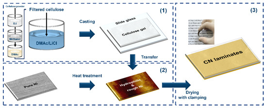 In this study, as a key to improving the strain transfer and encouraging electrical interaction at the interface, a cellulose/Ni (CN) laminate was designed without any adhesive, as shown in Figure 1. (1) Cellulose gel was prepared through consecutive processes consisting of the swelling sequence in a DMAc/LiCl solvent system after solvent exchange stages in several solvents due to the poor solubility of raw cellulose powder. Thereafter, the cellulose solution was casted on slide glass and pre-dried to obtain gel-type cellulose. (2) Ni was chosen for the MS phase because it exhibits magnetostrictive behavior even at a low magnetic field of less than 100 Oe [25,26]. Heat treatment of a Ni substrate was performed at different temperatures to regulate oxygen groups on the surface and the surface roughness. (3) The prepared cellulose gel and heat-treated Ni substrate were then completely clamped together and dried. Finally, the CN laminate was fabricated through a mild process without high pressure or high temperature, which could provoke undesirable damage on the samples, as shown in the inset displaying a real image of the flexible CN laminate in Figure 1. The hydrophilicity and topography of the heat-treated Ni substrates were investigated to determine the mechanism of the binderless state of the CN laminates. Moreover, their ferroelectric and ferromagnetic properties were explored to assess the possibility of using CN laminates for ME applications.