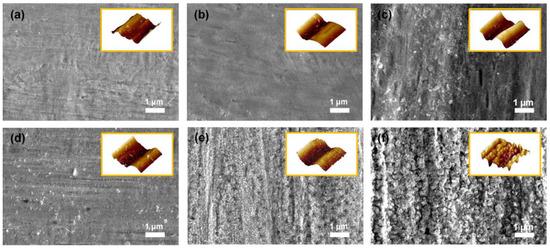 The surface roughness of the substrate is regarded as a crucial factor for the binderless state because binderless adhesion depends on the anchoring effect, in which the elastic polymer matrix is fixed within the rough structures on the metal surface by penetration [28]. Furthermore, the adhesion strength between the phases increased as the surface roughness increased, owing to the enlarged surface area for contact [29,30]. According to the literature, the degree of surface roughness of metal can be easily controlled by heat treatment owing to the indiscriminately organized surface metal oxide in proportion to the oxidation time and temperature [31,32,33]. Therefore, FE–SEM and AFM analyses were conducted to confirm the changes in the surface topography by the applied temperature. As shown in Figure 2a, the PN exhibited a convex morphology on the surface even before thermal oxidation. As seen in Figure 2b,c, no noticeable changes were detected until the applied temperature was 200 °C or less. However, after the heat treatment at temperatures over 300 °C, the surface of the Ni substrate became rougher with increasing the oxidation temperature. The small-sized cracks on the surface began to emerge when the applied oxidation temperature was above 300 °C. The nanoscale bump structure was detected in both the FE–SEM and AFM images. In particular, as shown in Figure 2d,e, the surfaces of Ni300 and Ni400 displayed both a bulk convex morphology and nano-bump structures in contrast to Ni500 (Figure 2f). The rough surface of the substrates with a structure containing bulk convex distortion and nano-bumps was the main factor for the anchoring effect.