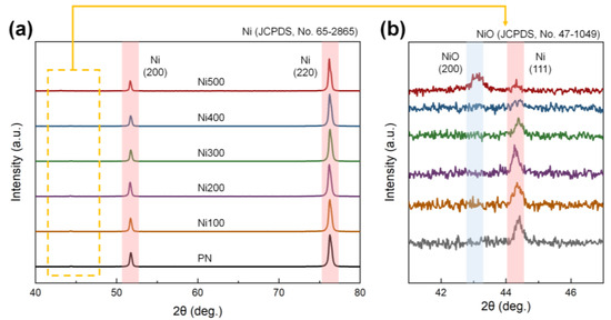 Although thermal treatment promotes the conditions required for binderless laminates, it may also result in improper crystallization. For instance, the formation of NiO, which exhibits antiferromagnetic features, could be facilitated during thermal oxidation, weakening the total ferromagnetic properties in the MS [35]. NiO also possesses a brittle mechanical character; thus, it can lead to inefficient strain transfer caused by defects and voids between the phases during mechanical deformation [36]. Because of the poor magnetic and mechanical properties reported, the rapid formation of NiO on the MS phases is inappropriate for the ME properties of laminates. Therefore, to confirm the presence of impurities on the surface of the substrate, XRD patterns of PN, Ni100, Ni200, Ni300, Ni400, and Ni500 were investigated, as shown in Figure 4a. In the XRD pattern, distinct peaks of (200) and (220) were observed at 51.74° and 76.26°, respectively, corresponding to Ni (JCPDS, No. 65-2865) [37]. To observe the details of the XRD patterns of Ni and NiO, a specific region of the XRD pattern was magnified. The XRD pattern in Figure 4b demonstrates that an additional peak that did not belong to pure Ni was observed only in the case of Ni500. The peak corresponding to the (200) plane of NiO appeared at 43.14°, which was in accordance with NiO (JCPDS, No. 47-1049). A peak of (111) at 44.42°, which was consistent with Ni, was also detected [38]. This diffraction peak implied that the crystallinity of NiO in the substrates was too low to be detected when the oxidation temperature was below 500 °C. Thus, most of the heat-treated Ni substrates did not exhibit clear NiO crystals, indicating only a higher number of oxygen groups and increased roughness, both of which are required for a binderless state.