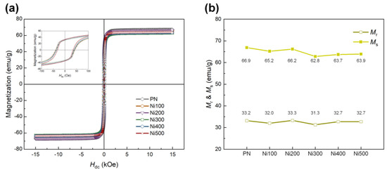 (a) M −H hysteresis loops of PN, Ni100, Ni200, Ni300, Ni400, and Ni500 in the range of ±15,000 Oe. The inset shows the small range of magnetization behavior for each sample according to the applied external magnetic field in the range of ±100 Oe. (b) Values of Mr and Ms for each sample.