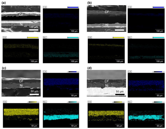 FE −SEM images of the cross-view morphology with EDS profiling of (a) CN200, (b) CN500, (c) CN300, and (d) CN400. EDS profiles are according to each FE −SEM image. The PE and MS phases were identified by detecting the distribution of carbon, oxygen, and nickel atoms.