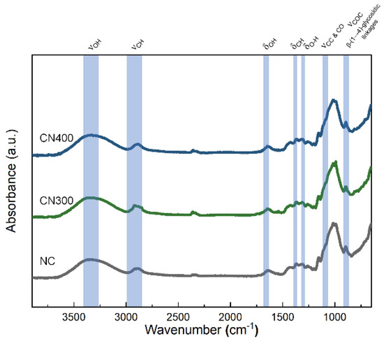 FT −IR spectra of NC, CN300, and CN400 in the range of 650–4000 cm−1.