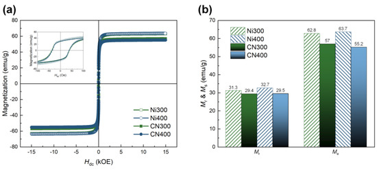 (a) M −H hysteresis loops of Ni300, Ni400, CN300, and CN400 in the range of ±15,000 Oe. The inset shows a small range of magnetization behavior according to the applied external magnetic field in the range of ±100 Oe. (b) Comparison of MS and Mr between the heat-treated Ni substrates and CN laminates.