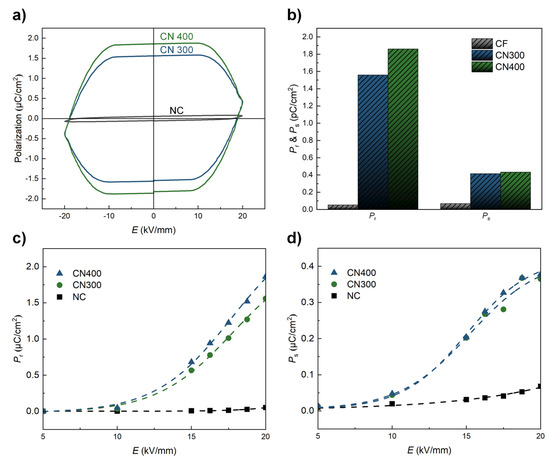 (a) P −E curves of NC, CN300, and CN400 in the range of ±20 kV/mm. (b) Pr and Ps plots of NC, CN300, and CN400 under a maximum electric field of 20 kV/mm. (c,d) Pr and Ps of each sample as a function of the applied electric field.