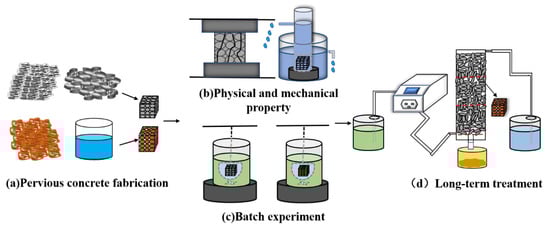 To explore the effects of RMPC and raw pervious concrete on heavy metals in solutions corresponding to concentrations present in the heavy metal pollutes at Qibaoshan, the relevant masses of MnSO4•H2O, ZnSO4•7H2O, CdCl2•2.5H2O and CuSO4•H2O were dissolved in ultrapure water to prepare simulated acid mine drainage. The initial pH values and elemental concentrations are listed in Table S1. Referring to the experimental process by Holmes et al. (Figure 1) [13], batch experiments for heavy metal removal were carried out using a magnetic stirrer (rotation speed of 500 rpm), and samples were collected every 15 min until the end of the experiment. Immediately after collecting the treated samples, the pH of the wastewater was measured. Next, ICP–OES was used to determine the equilibrium concentrations of the individual metals. Each group of concrete cubes (including the control group) were tested in triplicate.