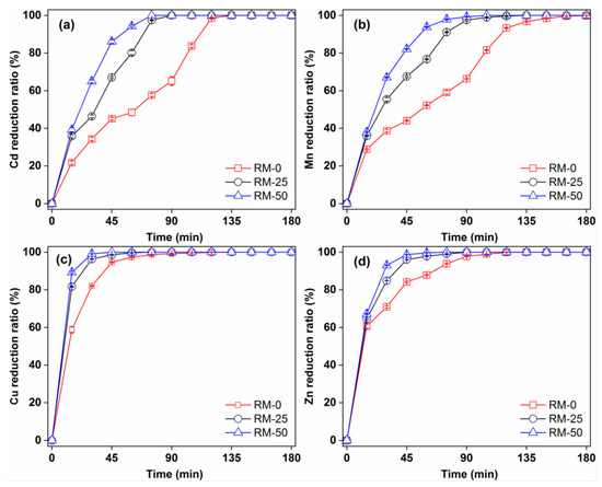 Time–dependent removal of (a) Cd, (b) Mn, (c) Cu and (d) Zn in RMPC with different red mud contents.