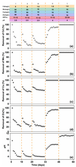 In Stage V, to further ensure the stability and complete removal of heavy metals, the hydraulic retention time was increased. Results showed that the pH of the discharged effluent remained stable for 15 days and the removal of Cd(II), Mn(II), Cu(II) and Zn(II) was almost complete. Thus, the concentrations of heavy metals in the discharged effluent can achieve the national discharge standard, and RMPC successfully performed the function of heavy metal treatment under these conditions.