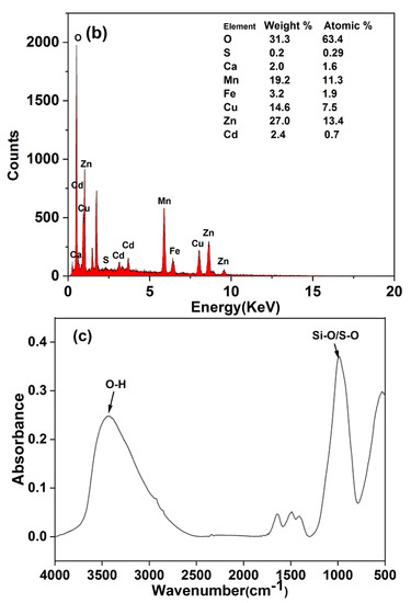 The XRD, EDS and FT–IR spectra of the precipitates are shown in Figure 5. EDS spectra showed that the precipitate was mainly composed of O, Mn, Zn, Cu, Cd and other elements, indicating that heavy metals had been precipitated out. Ca, S and Fe were also observed. The precipitate produced was characterised using an X–ray diffractometer (Figure 5a), and XRD images consistent with those of ferrihydrite were obtained [26]. A large amount of Fe(III) in the red mud was hydrolysed and formed one of the precipitates. Figure 5c shows the Fourier spectrum of precipitate, where absorption peaks were concentrated near 3420 cm−1 and 990 cm−1, and three weak absorption peaks appeared at 1318–1635 cm−1. The strong absorption peak at 3420–3440 cm−1 was caused by the O–H stretching vibration [27,28], and the peak near 1620 cm−1 was caused by the O–H bending vibration [29,30]. Therefore, it was proven that a large amount of hydroxide was present in the precipitate. The peak near 1400 cm−1 was caused by the C–OH bending vibration [31,32], which is present due to formation of a polymeric precipitate with iron. The absorption peak at 988 cm−1 was caused by the stretching vibration of Si–O and S–O [31], which are silicate and sulphate precipitates. It was inferred that that calcium silicate and calcium sulphate were precipitated.