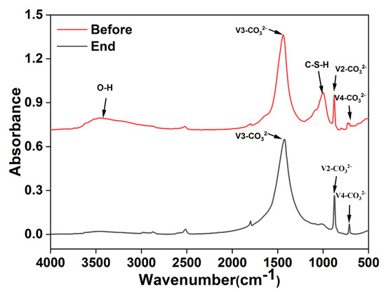 The FT–IR image of RMPC was obtained by superimposing the spectral curves of the various substances, as shown in Figure 6. The sharp absorption band near 875 cm−1 corresponds to the bending vibration of V2–CO32−, the band in the range of 1400–1450 cm−1 corresponds to the stretching vibration of V3–CO32−, and the band near 720 cm−1 is the bending vibration of V4–CO32− [27,33]. The main component was carbonate in the aggregate, which showed no significant change before and after the test. It was confirmed that the aggregate did not react with heavy metals during the test. The absorption band at 1001 cm−1 observed before the test was attributed to the presence of C–S–H formed after hydration [28]. The weak absorption peak at 3455 cm−1 was caused by the O–H stretching vibration, which was a part of C–H and some unreacted hydrate particles [34]. The C–S–H and C–H decreased sharply in the images after the test. This indicated that these components were released into the solution through hydration and hydrolysis, converted into hydroxide after reacting with heavy metals and calcium reacting with sulphate.