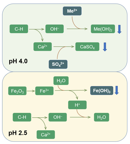 The processes of wastewater entering the concrete are shown in Figure 8. The micro–melted C–H in the concrete underwent hydrolysis, releasing Ca2+ and OH+ into the water (C–H→Ca2+ + OH−), where the pH increased (Figure S1). When the input wastewater pH was 2.5, Fe(III), which originated from the haematite in the red mud, began to dissolve. The Fe(III) in the water hydrolysed preferentially (Fe3+ + 3H2O ⇋ Fe(OH)3 + 3H+ (pH < 3–3.7)) to form Fe(OH)3 and released large amounts of H+, which consumed OH− released by the concrete. Consequently, the precipitation of other heavy metals decreased rapidly, and the removal efficiency of heavy metals decreased. When the input wastewater pH was ≥4, Fe (III) dissolution was reduced. The SO42− in the water began to react with Ca(II) and generated CaSO4 precipitate (pH > 3.5–4), which was found in the precipitate. This process greatly consumed the Ca(II) in water, which promoted C–H→Ca2+ + OH− to tend towards the right. Thus, OH− was constantly released, ensuring that there was sufficient OH− to react with the heavy metal ions, which were constantly removed.