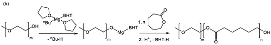 CL polymerization catalyzed by phenolate–benzyloxy–magnesium complex (a). Synthesis of mPEG-based block-copolymer catalyzed by phenolate-mPEG-magnesium made in situ (b).