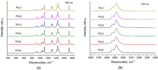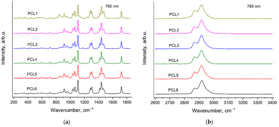 Raman spectra of six PCL samples (see Section 2.2. Polymers synthesis), recorded with the excitation wavelength of 785 nm in the regions 200–1850 cm−1 (a) and 2600–3400 cm−1 (b).