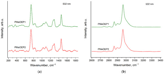 Raman spectra of two PMeOEP samples (see Section 2.2. Polymers synthesis), recorded with the excitation wavelength of 532 nm in the regions 200–1850 cm−1 (a) and 2600–3400 cm−1 (b).