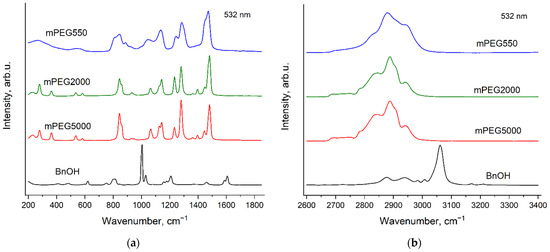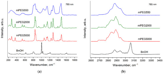 Figure 7 and Figure 8 demonstrate the Raman spectra of the initiators: BnOH and mPEGs, which were used for the synthesis in this study. The spectra were recorded using two excitation wavelengths: 532 nm (Figure 7) and 785 nm (Figure 8). It can be seen that the spectra of two solid mPEGs (mPEG2000 and mPEG5000) are evidently different. Furthermore, the spectra of the solid mPEGs differ noticeably from the spectrum of liquid mPEG (mPEG550), but these differences are due to the different aggregate states rather than to the different molecular weights or change in the conformational composition of molecules. In particular, it was recently shown [44] that at room temperature, molecules of both liquid and solid PEGs with various molecular weights adopt predominantly the conformation of helix 72.