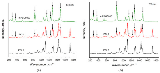 Raman spectra of PCL1, PCL6 (see Section 2.2. Polymers synthesis) and mPEG5000, recorded with the excitation wavelengths of 532 nm (a) and 785 nm (b) in the region 200–1850 cm−1. The arrows show the mPEG5000 bands, observed in the PCL1 spectrum.