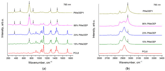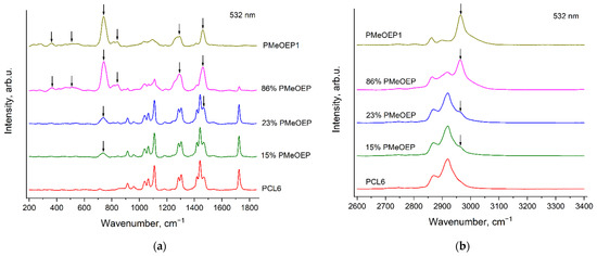 Raman spectra of PMeOEP1, PCL6 and PCL—b—PMeOEP copolymers (see Section 2.2. Polymers synthesis), recorded with the excitation wavelength of 532 nm in the regions 200–1850 cm−1 (a) and 2600–3400 cm−1 (b). The arrows show the PMeOEP bands, observed in the spectra of the copolymers.