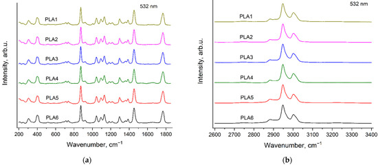 Raman spectra of six PLA samples (see Section 2.2. Polymers synthesis), recorded with the excitation wavelength of 532 nm in the regions 200–1850 cm−1 (a) and 2600–3400 cm−1 (b).