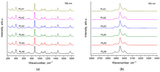 Raman spectra of six PLA samples (see Section 2.2. Polymers synthesis), recorded with the excitation wavelength of 785 nm in the regions 200–1850 cm−1 (a) and 2600–3400 cm−1 (b).
