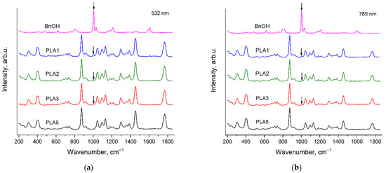 Raman spectra of PLA1, PLA2, PLA3, PLA5 (see Section 2.2. Polymers synthesis) and BnOH, recorded with the excitation wavelengths of 532 nm (a) and 785 nm (b) in the region 200–1850 cm−1. The arrows show the BnOH band, observed in the PLA1, PLA2 and PLA3 spectra.
