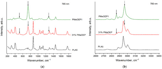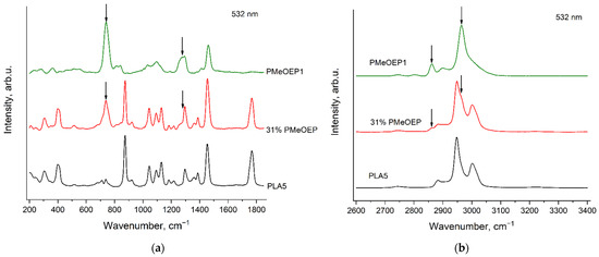 Raman spectra of PMeOEP1, PLA5 and PMeOEP—b—PLA copolymer (see Section 2.2. Polymers synthesis), recorded with the excitation wavelength of 785 nm in the regions 200–1850 cm−1 (a) and 2600–3400 cm−1 (b). The arrows show the PMeOEP bands, observed in the copolymer spectrum.