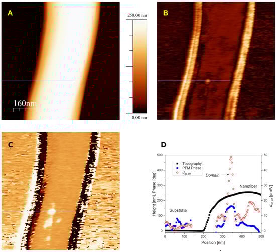 In Figure 2, AFM topography (A) and corresponding CE-FM-PFM amplitude (B) and phase scan (C) of a single nanofiber (250 nm diameter) is shown. From a representative line profile (Figure 2D), values of the amplitude modulation ΔAΩ (PFM amplitude) measured on the fiber upper surface are consistent with expectations (10–20 pm/V) Much higher values were recorded on its sides (not shown for clarity in Figure 2D). This is a general feature of scanning probes applied to samples with steep topographic reliefs, since it is well known that the probe sides, rather than the tip edge, may contact the surface at steep slopes, giving rise to tip shape artifacts []. All measured quantities are prone to the same effect, so that their values should not be considered as reliable at the slopes of the structure. Therefore, only the results obtained at the nanofiber top will be considered here. An averaged effective piezoelectric coefficient d33,eff ~ 13 pm/V was obtained, that is consistent with the literature data for the semicrystalline PVDF containing the ferroelectric β phase [,,].
