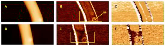 Topography (A), CE-FM-PFM amplitude (B) and phase (C) scan of an electrospun PVDF/BaTiO3 composite nanofiber deposited on doped silicon, where an embedded BaTiO3 nanoparticle is present (NP), indicated by the arrow. Nanodomains appear at the center of the fiber upper surface, where the PFM phase is inverted. The nanoparticle shows lower piezoresponse, while its border shows a higher signal. Topography (D), CE-FM-PFM amplitude (E) and phase (F) of the same nanofiber portion after poling by application of a DC potential to a region indicated by the rectangle in (B,E). Phase inversion is obtained after poling on the PVDF nanofiber, as well as on the nanoparticle and part of the nanodomains. The scan size is 1.28 μm × 0.5 μm. The same color bar of the image of Figure 2A defines the scale for the values of topography images (A,D) (0/250 nm), PFM amplitude (B,E) (0/50 pm/V) and phase (C,F) (−180°/+180°).