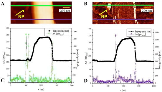 (A) Topography and (B) PFM amplitude scan of an electrospun PVDF/BaTiO3 composite nanofiber as deposited on the rotating electrospinning aluminum substrate, on which a BaTiO3 nanoparticle is also visible, indicated by the arrow. (C) Line profiles corresponding to the green line in (A,B), crossing the nanoparticle. (D) Line profiles corresponding to the purple line in (A,B), not crossing the nanoparticle. The applied potential Vac was 1 VRMS here; therefore, the ΔA value corresponds to the piezoelectric coefficient.