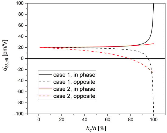 Dependence of the overall displacement for 1 V electric potential (d33,eff) from the relative thickness hc/h of the two layers (crystal and polymer) considered in the simple picture leading to Equation (2). Black curves (case 1): εc = 1000, εp = 10, dc = 100 pm/V, dp = 20 pm/V; red curves (case 2): εc = 50 [], εp = 10, dc = 27 pm/V [], dp = 20 pm/V. Solid curves: case of same orientation of the polar axes of crystal and polymer; dashed curves: case of opposite orientations.