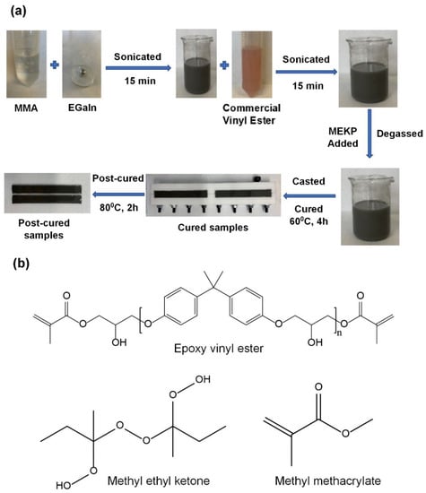 Preparation of EGaIn-modified vinyl ester composites (a) and chemical structure of vinyl ester, MEKP, and MMA (b).