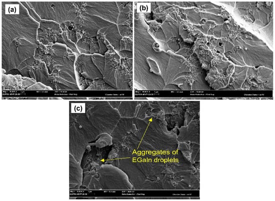 SEM image of the fracture surface of the cVE composites containing 0.5% (a), 1%(b), and 2% EGaIn (c).