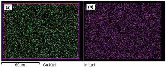 EDX mapping images of the fracture surface of the 1% EGaIn-modified cVE composites. Dispersion of gallium (a) and indium (b) elements.