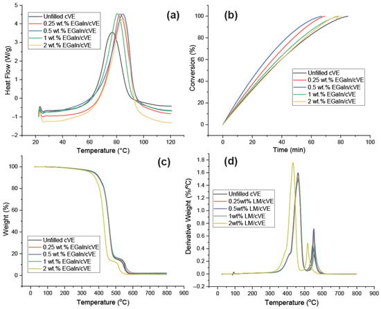 Differential scanning calorimetry (DSC) and thermogravimetric analyser (TGA) studies were used to investigate the effect of EGaIn on the curing behaviour of cVE networks. Figure 5a depicts modulated DSC heat flow graphs for cVE composites with varying EGaIn concentrations. The curing reaction parameters related to the temperature of onset (To), peak temperature (Tp), temperature of completion of the exotherm (Tf), and heat of reaction (ΔH) were noted and are summarised in Table S1 (Supplementary Materials). The initiation of a crosslinking reaction can be seen to be in the range of 65.08–66.94 °C for all of the modified compositions, compared to 65.01 °C for the unfilled cVE system. The same pattern is observed for the completion of exotherm temperature, which is 89.59–92.85 °C for the EGaIn-modified cVE compositions compared to 89.11 °C for the composition without filler loading. It is evident that no significant changes can be observed for the To and Tf values of the filled and unfilled cVE samples. Similar results were also observed for Tp. In comparison with the unfilled cVE system (76.89 °C), Tp values (82.8, 84.9, 80.6, and 84.72 °C corresponding to 0.25, 0.5, 1, and 2 wt.% filler) exhibited an insignificant difference, with the difference being from just 4.8% to 10%. On the other hand, the ΔH values of the EGaIn/cVE are 4.53, 4.52, 4.55, and 4.32 (W/g) corresponding to 0.25, 0.5, 1, and 2 wt.% filler. It can be seen that these values higher by 22% to 27% than those of the composition without filler content (3.54 W/g). The increase in ΔH upon the incorporation of EGaIn suggests a higher cross-linking degree within the cVE matrix, thus implying the effect of EGaIn on the curing reaction. Such behaviour could result from the formation of the ion–dipole interaction between the interface of Ga3+ produced from the EGaIn droplets via sonication with the carbonyl group in the cVE polymer chain during the curing process [30]. It should be noted that at higher EGaIn concentrations (2 wt%), the ΔH value shows a slight reduction. This could be explained due to the formation of some aggregates of EGaIn droplets owing to their high concentration, which causes a reduction in activated free radicals, leading to less interaction between EGaIn droplets and cVE matrix. Moreover, the degree of conversion at a certain curing temperature was also employed to determine the curing reaction degree. Figure 5b illustrates the degree of conversion of the filled and unfilled cVE composites at a 60 °C curing temperature. It is apparent that the degree of conversion of the reinforced composites is almost higher than that of the unfilled system except for the degree of conversion of the sample containing 2 wt.% EGaIn, which is nearly the same. It can be seen that this result is consistent with the obtained ΔH result. Figure 5c and d illustrate the thermogravimetric analysis (TGA) and derivative thermogravimetric (DTG) curves of the composites with the content 0.25, 0.5, 1, and 2 wt.% EGaIn. It was observed that the thermograms show the typical two-step degradation of the cVE system as the temperature increases from ambient to 800 °C [52]. As illustrated in Figure 5d, the filled cVE composites containing 0.25, 0.5, and 1 wt.% EGaIn show no significant change in both the decomposition temperature (Tonset) and Tmax (the temperatures at maximum weight loss) compared to the unfilled cVE system. This implies that the presence of EGaIn up to 1 wt.% has almost no effect on the thermal stability of the respective EGaIn/cVE composites. However, by adding 2 wt.% EGaIn content, the Tonset and Tmax of this composite decreased and they are both lower than those of the unfilled cVE system. This suggests that further increase in EGaIn loading can promote mass loss during the thermal degradation process.