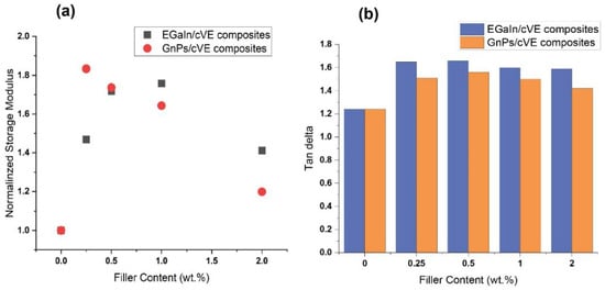 The dynamic properties, including the storage modulus (E′) and tan delta, were determined to investigate the effect of the introduction of fillers on the thermomechanical properties of the cVE matrix. Figure 6 shows the normalized storage modulus and the tan delta of both EGaIn/cVE and GnPs/cVE composites versus the weight fraction of the fillers. The normalized storage modulus was obtained based on the ratio between the storage modulus of the filler-modified cVE composites (E′EGaIn/cVE; E′GnPs/cVE) and the storage modulus of the cVE matrix (E′cVE). As depicted in Figure 6a, both EGaIn/cVE and GnPs/cVE composites exhibit a remarkable enhancement in the normalized storage modulus for all filler contents from 0.25 to 2 wt.%. An increase from 1.4 to 1.76 times in the normalized storage modulus was observed for the EGaIn/cVE composites in comparison with 1.2 to 1.83 times for the GnPs/cVE composites (Table S2, Supplementary Materials). The improvement in the normalized storage modulus of both EGaIn/cVE and GnPs/cVE composites implies that the stiffness of the cVE network would be enhanced as both EGaIn droplets and GnPs were introduced. This phenomenon could be explained by enhancement of the interfacial interactions between the filler interface and the cVE matrix. This effectively restricts the movement of cVE polymer chains with the beginning of glass transition temperature (Tg) and promotes energy dissipation from the matrix to fillers, resulting in an increase in the elastic modulus [53,54]. However, the improvement of the normalized storage modulus showed a reduction as both EGaIn and GnPs are further added. This behaviour could be attributed to the formation of agglomerations, which limit interfacial contacts between the filler surface and the cVE matrix, resulting in a decrease in the restriction of cVE polymer chain mobility. As a result, the normalized storage modulus enhancement decreased abruptly.